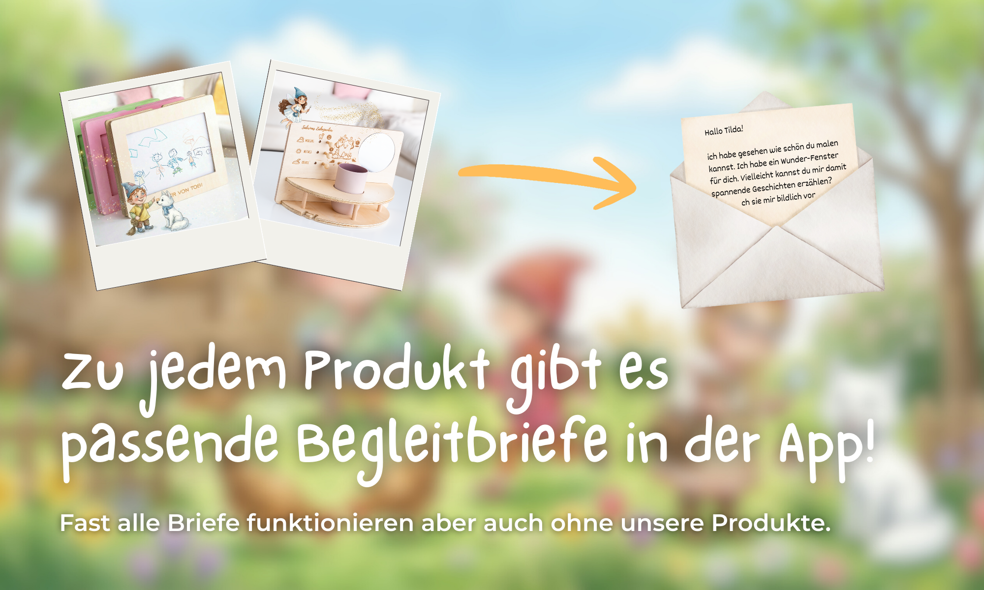In der App findest du individuelle Briefe von eurem Wichtel, die das Produkt zum Leben erwecken. Oder auch spannende Abenteuer und liebe Worte, die auch ganz ohne Produkt funktionieren.