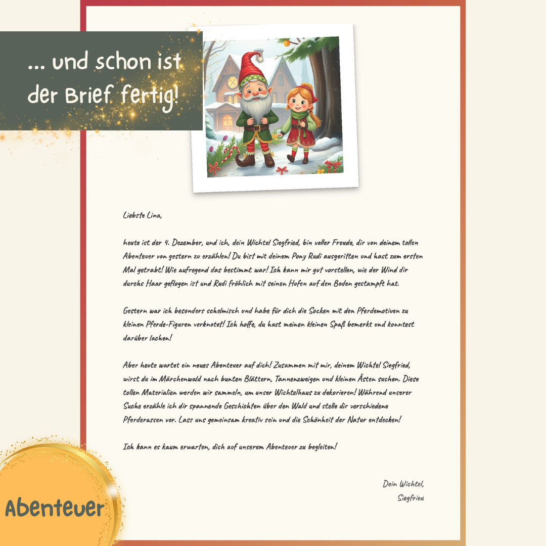Stell dir vor, der kleine Brief vom Wichtel am Morgen zaubert nicht nur ein Lächeln, sondern ein ungläubiges, riesengroßes Staunen ins Gesicht deines Kindes. Weil der Wichtel... von GESTERN erzählt.